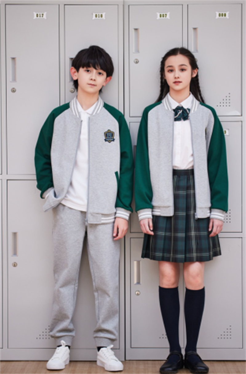 “后疫情”时代,人们需要一种治愈的力量,也更加注重健康的生活方式,象征着生机、希望、健康、环保的绿色成为2023年的流行色。而校园生活的正常回归,同学们充满了自信和能量,学校又恢复了健康活力的气息。因此,以绿色作为主色调的“健康守护”系列,展现出生机盎然的青春时代,清新的颜色,怡人的视觉,使人有一种拥抱大自然的快意,重获新生,心境豁然开朗。本系列校服通过撞色拼块设计手法,款式搭配上沿袭经典的英伦款式,打造出简约、时尚的英伦学院风格,潜移默化中影响着学生的气质和审美。